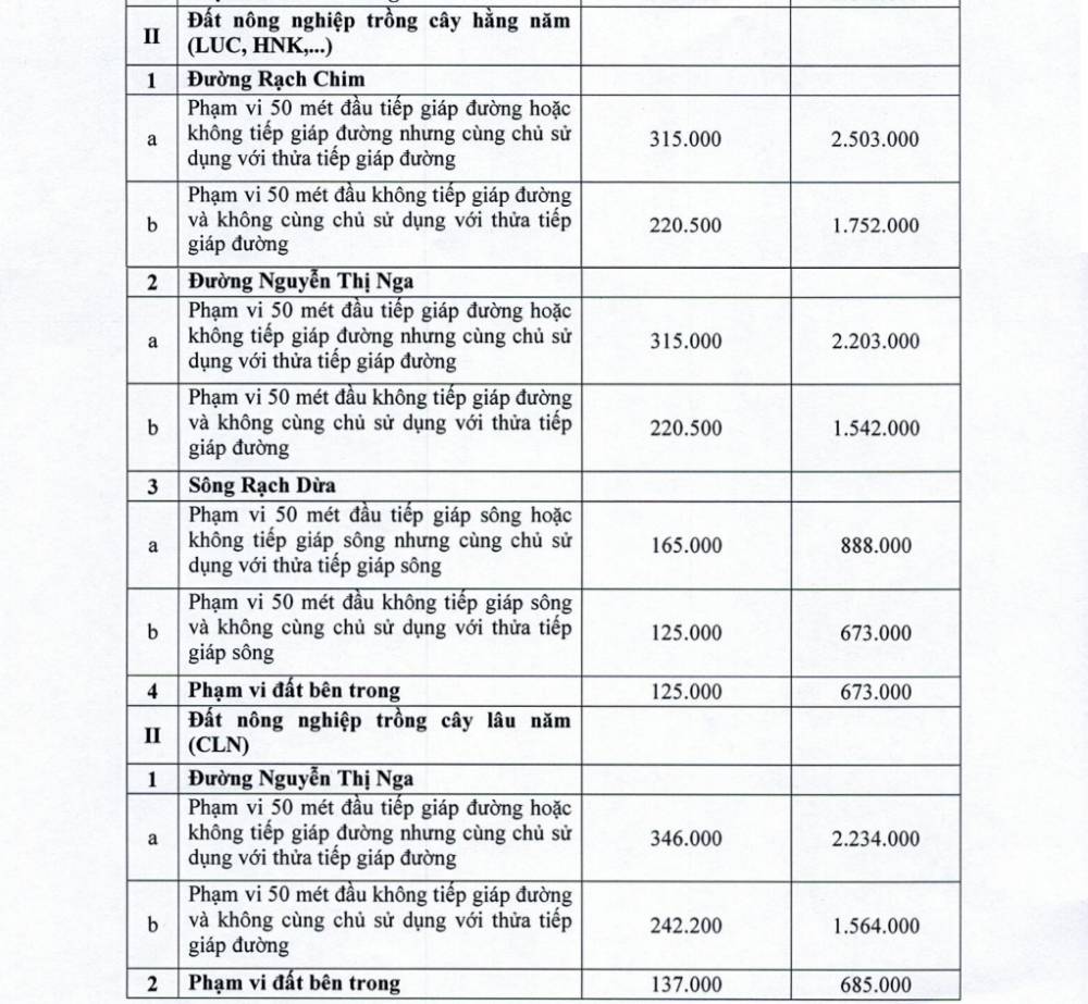- Khu vực tiếp giáp đường Rạch Chim: giá đề xuất gần 9 triệu đồng/m2 đối với vị trí thuận lợi