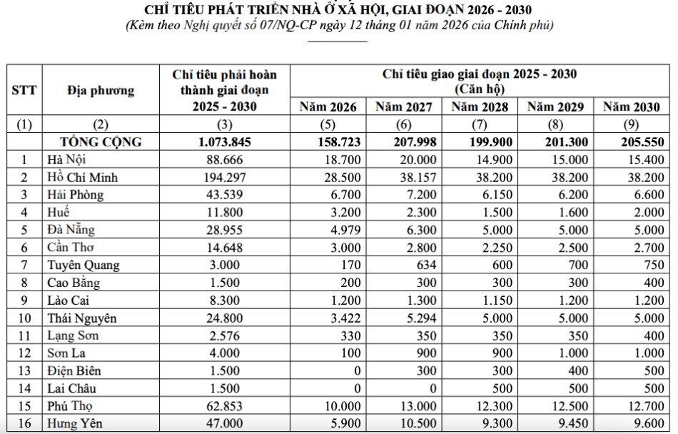 Tại Thái Nguyên, kết quả phát triển nhà ở xã hội ghi nhận nhiều tín hiệu tích cực khi địa phương đã hoàn thành 4.223 căn, gấp gần 4 lần chỉ tiêu được giao. Trong khi đó, ba tỉnh Cao Bằng, Điện Biên và Lai Châu không được giao chỉ tiêu phát triển nhà ở xã hội trong năm.