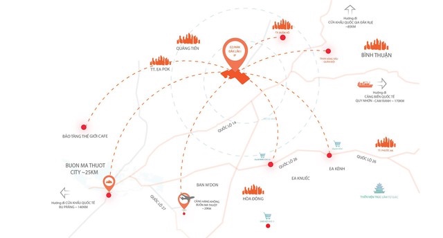 Dự án sở hữu vị trí chiến lược khi nằm ngay khu vực kết nối trọng điểm vùng Tây Nguyên, tiếp giáp với Quốc lộ 14 và kết nối trực tiếp với Cao tốc Buôn Ma Thuột – Khánh Hòa sẽ thông xe kỹ thuật toàn tuyến giai đoạn 1 vào ngày 19/5/2026. Lợi thế này tạo ra mạng lưới giao thông đa phương thức cực kỳ thuận tiện.