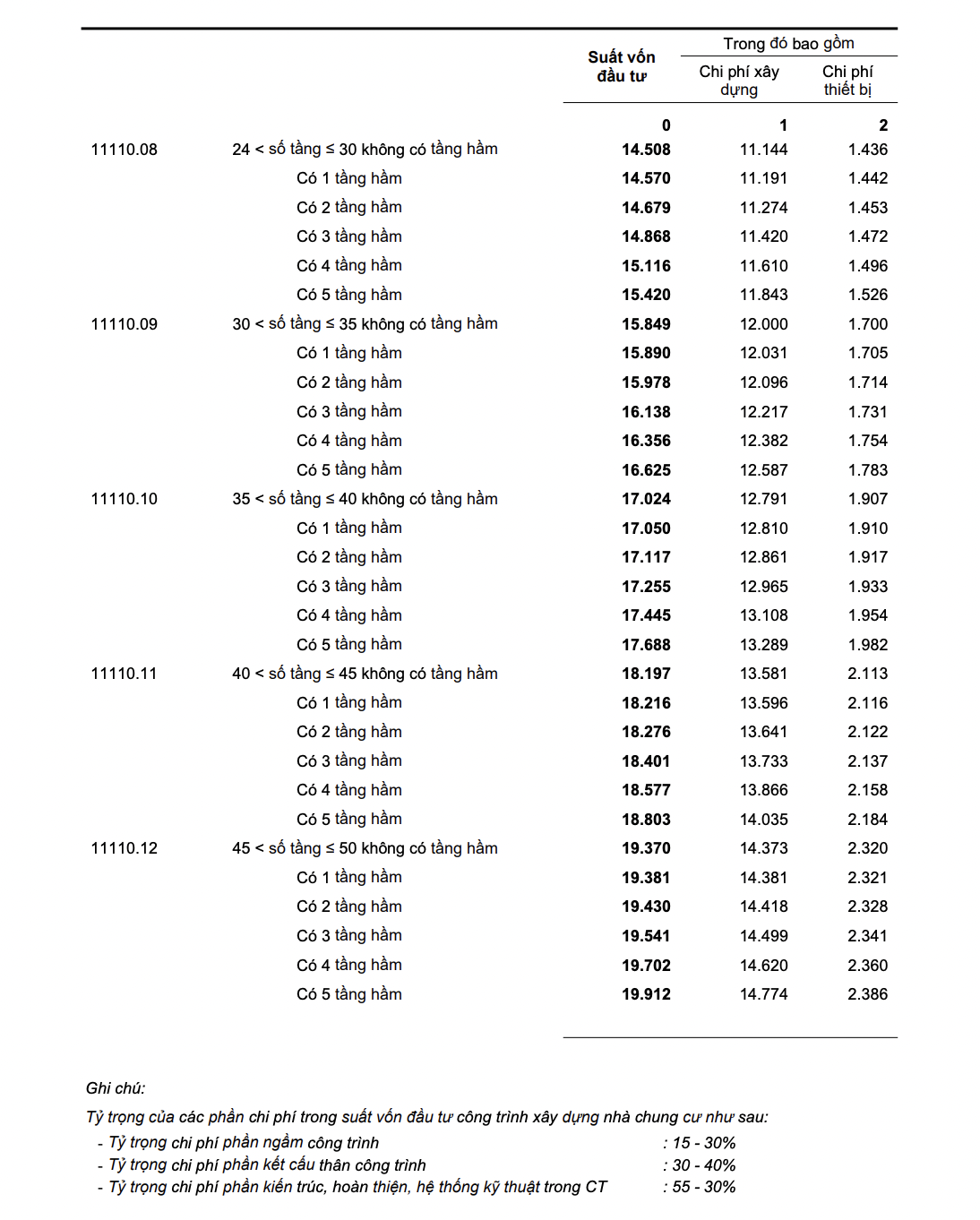 Theo Quyết định số 425/QĐ-BXD, với công trình nhà chung cư, suất vốn đầu tư thấp nhất là 9,202 triệu đồng/m2, áp dụng cho công trình từ 5 tầng trở xuống, không có tầng hầm và cao nhất là 19,912 triệu đồng/m2, áp dụng cho công trình trên 45 tầng đến 50 tầng: