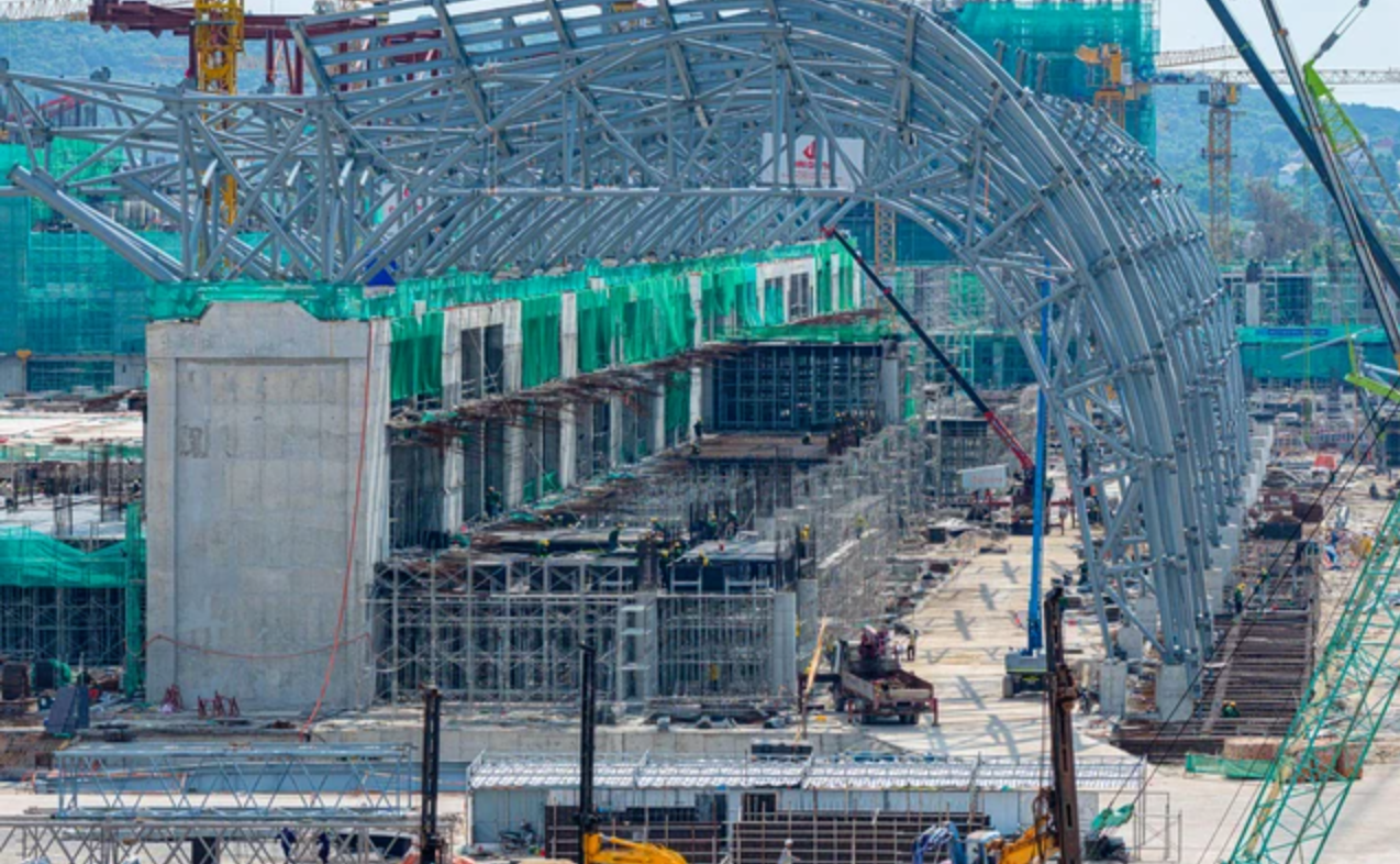 Kết cấu thép mái nhà ga T2 Cảng Hàng không Quốc tế Phú Quốc tập hợp tại công trình.