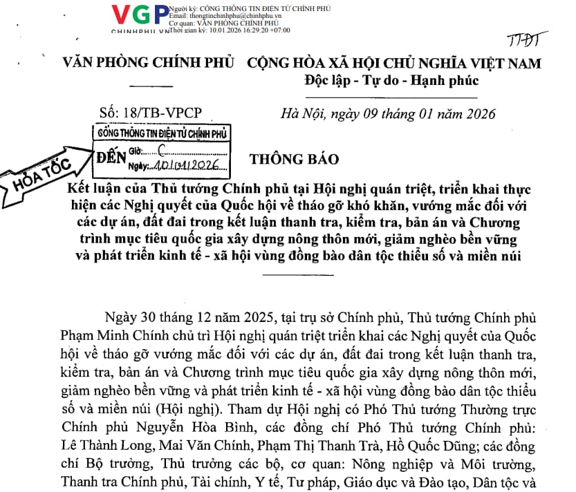Ngày 9/1/2026, Văn phòng Chính phủ đã ban hành Thông báo 18/TB-VPCP năm 2026 về kết luận của Thủ tướng Chính phủ tại Hội nghị quán triệt, triển khai thực hiện các Nghị quyết của Quốc hội về tháo gỡ khó khăn, vướng mắc đối với các dự án, đất đai trong kết luận thanh tra, kiểm tra, bản án và Chương trình mục tiêu quốc gia xây dựng nông thôn mới, giảm nghèo bền vững và phát triển kinh tế - xã hội vùng đồng bào dân tộc thiểu số và miền núi.