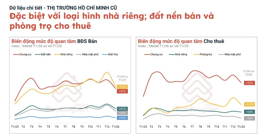 Theo dữ liệu của nền tảng công nghệ Batdongsan.com.vn, đầu năm 2026, mức độ quan tâm bất động sản tại TP.HCM có sự tăng trưởng, đặc biệt là phân khúc phòng trọ cho thuê với lượng tìm kiếm tăng 130%.