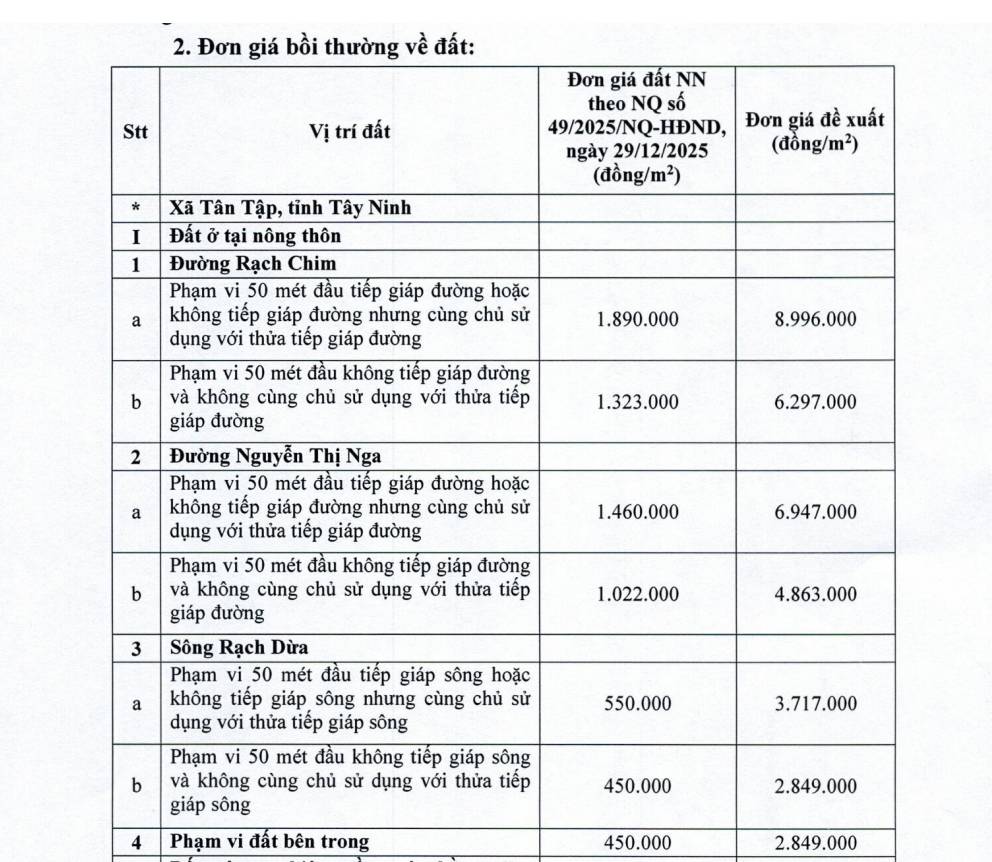 Đơn giá bồi thường đất ở cao nhất gần 9 triệu đồng/m2 cùng tổng kinh phí hơn 122 tỷ đồng là những con số đáng chú ý trong phương án bồi thường dự án Vành đai 4 TP.HCM qua xã Tân Tập, tỉnh Tây Ninh vừa được niêm yết công khai.