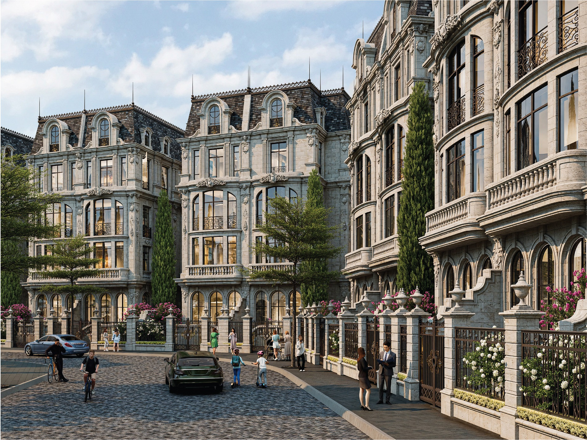 Ở lớp giá trị sản phẩm, những dinh thự được phát triển theo phong cách kiến trúc cổ điển châu Âu, quy hoạch đồng bộ với mật độ xây dựng thấp, tạo nên một không gian sống mang tính biệt lập so với các khu đô thị đại trà. 100% dinh thự được thiết kế với hồ bơi riêng, vườn tư gia và không gian đa năng linh hoạt, vận hành theo tiêu chuẩn 5 sao, đồng thời tích hợp hệ tiện ích khép kín gồm clubhouse, lounge bar riêng tư và công viên xanh theo chuẩn sống châu Âu.
