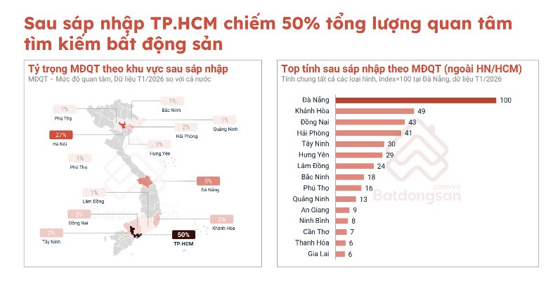 Dữ liệu của nền tảng công nghệ Batdongsan.com.vn cho thấy TP.HCM (mới) khẳng định vị thế là tâm điểm thị trường khi chiếm tới 50% tổng lượng quan tâm đến bất động sản toàn quốc.